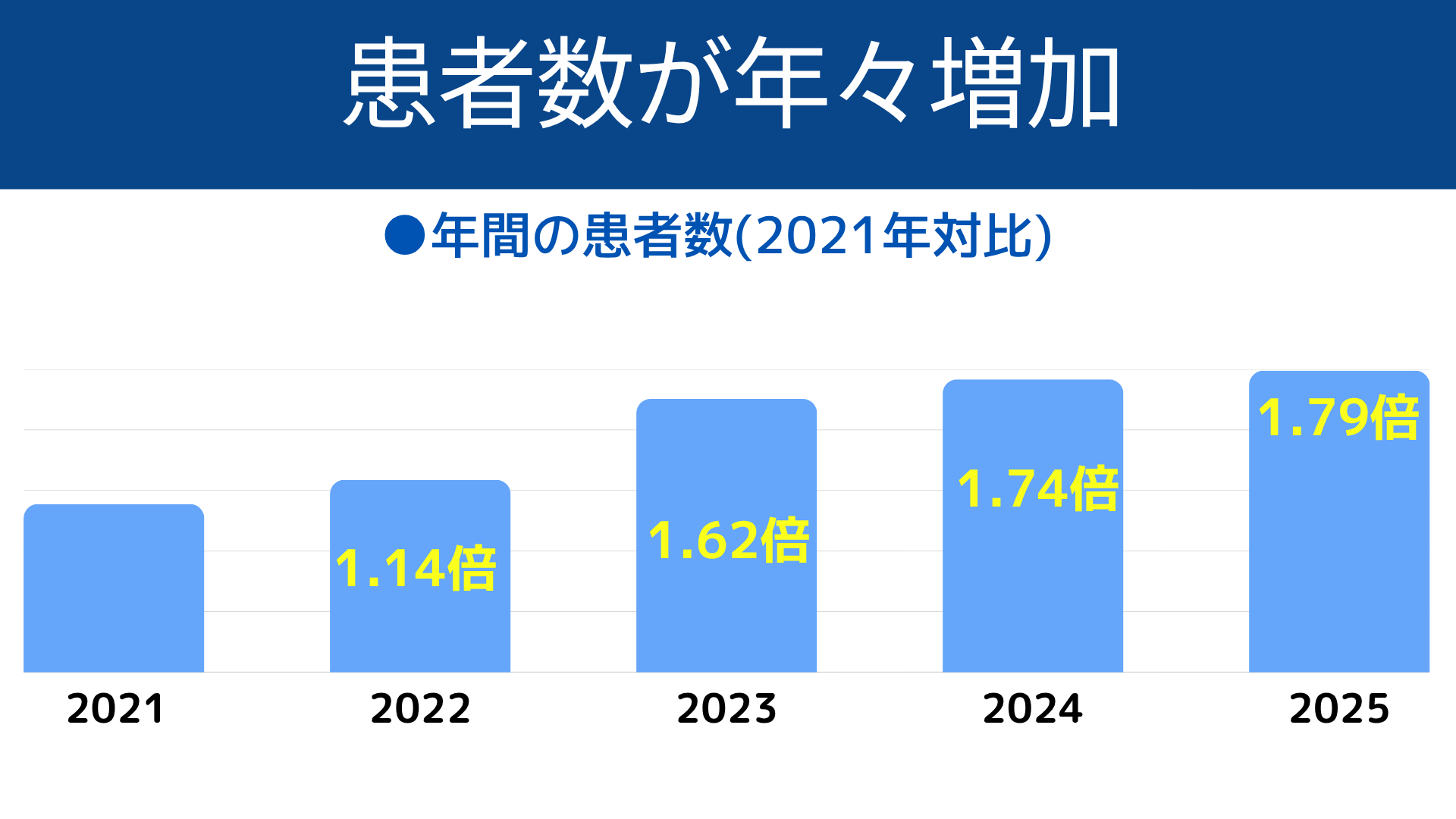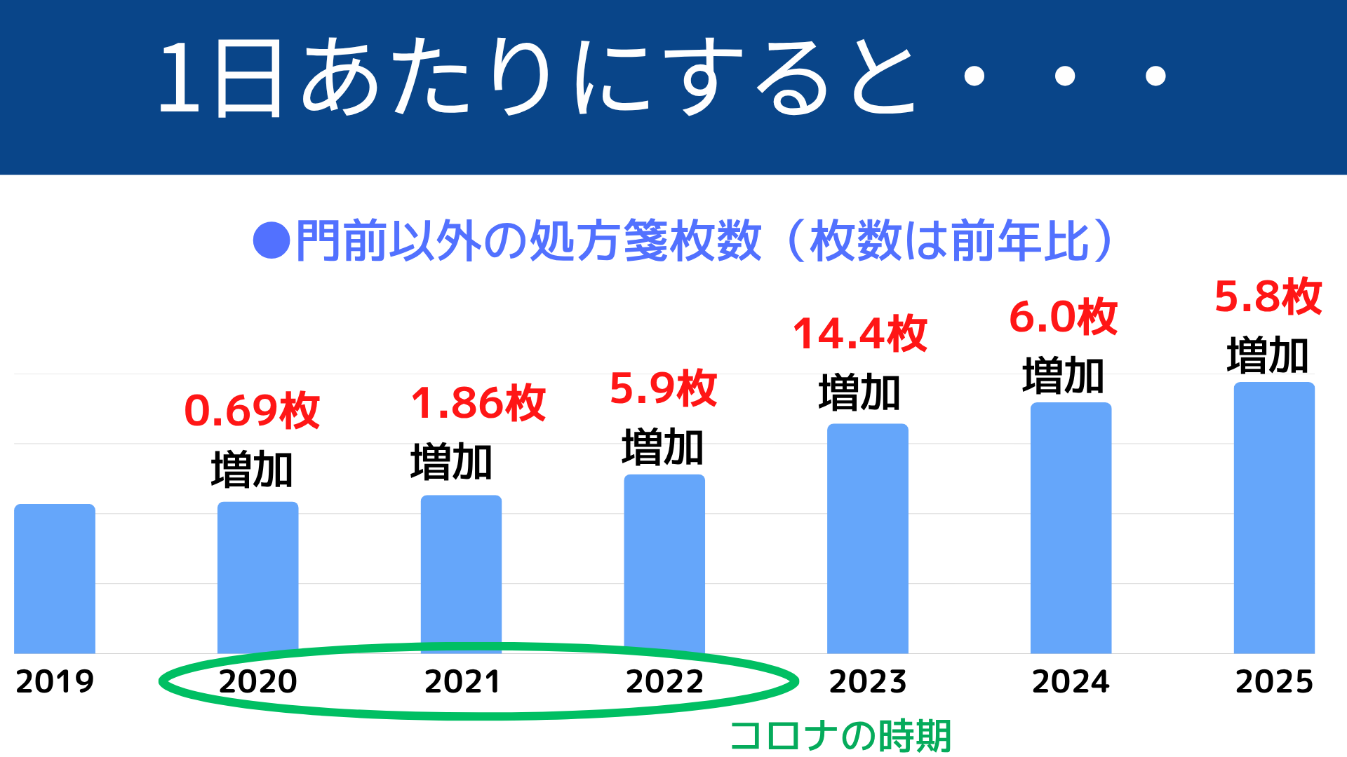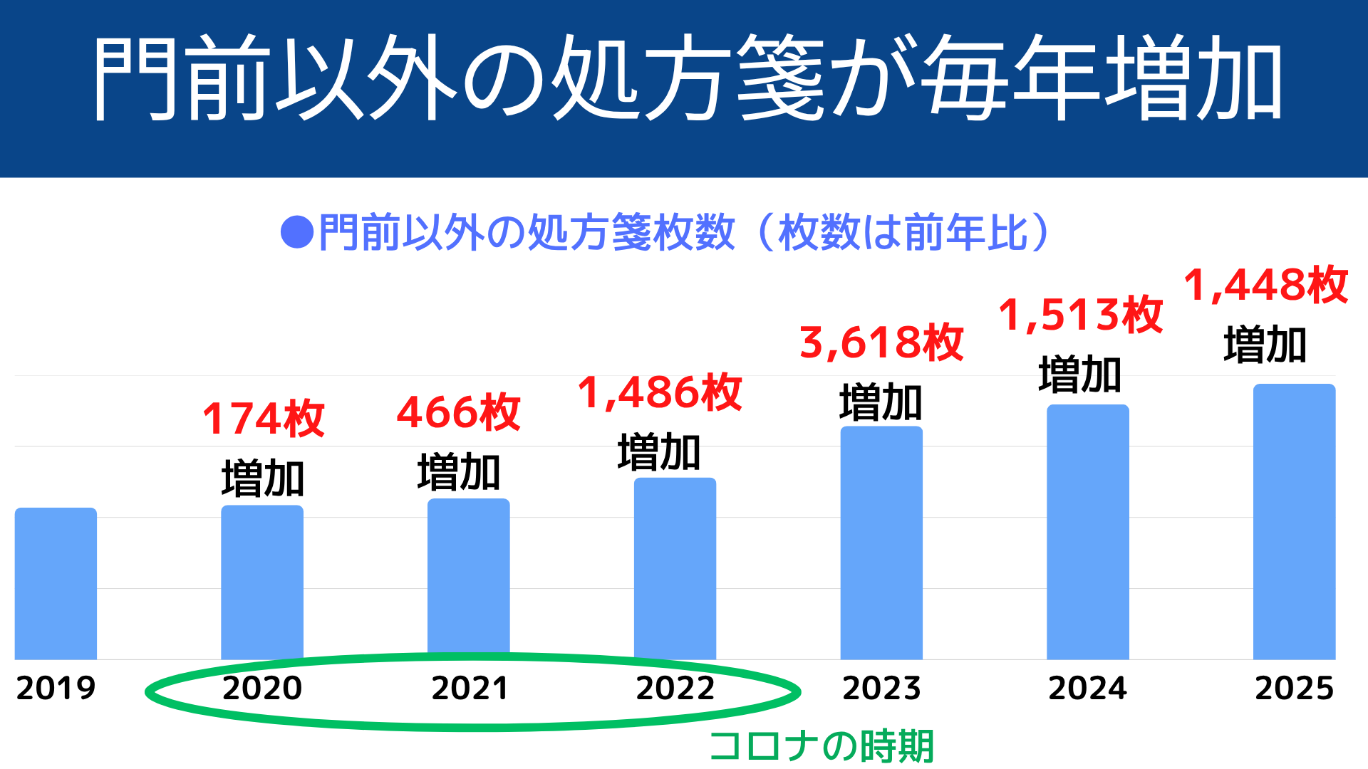 門前以外の処方箋は年々増え続け、コロナ禍でも、面の処方箋は増え続ける結果となりました。2026年現在も増え続けています。